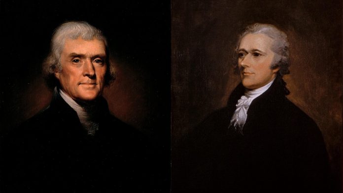 Alexander Hamilton si Thomas Jefferson au avut opinii opuse asupra economiei, ceea ce a dus la conflict. Hamilton credea intr-un guvern central puternic si pentru a obtine acest lucru, bogatia a fost cheia. El a vrut sa faca Statele Unite ale Americii bogate pentru ca acestea sa devina un guvern foarte puternic. Hamilton a invatat direct cum este sa castigi existenta si, de aceea, a crezut ca bogatia este fundatia pentru construirea unei natiuni puternice. El a simtit ca cei cu bogatie, comercianti cunoscuti acum ca om de afaceri, vor lansa SUA in bogatie si putere. De asemenea, credea ca odata cu bogatia vine si cunoasterea. Cand Hamilton si-a inceput calatoria ca secretar al Trezoreriei, s-a confruntat cu multe dificultati; Datoria nationala a fost un mare obstacol. El a simtit cea mai mare importanta in achitarea tuturor datoriilor noastre. Acest lucru a fost semnificativ pentru a construi un credit bun si pentru a crea prima noastra Banca Nationala, Banca Statelor Unite. Pe de alta parte, ideea lui Jefferson despre America a fost una construita de fermieri si nu de comercianti. El credea ca singura persoana care era cu adevarat libera erau intr-adevar fermierii. Era hotarat si pasionat de Libertate, a fost fundamentul lui. De asemenea, a fost un puternic sustinator al educatiei gratuite. De la invatamantul elementar pana la colegiu, el a sperat ca vom fi capabili sa ne pastram libertatea si libertatea.